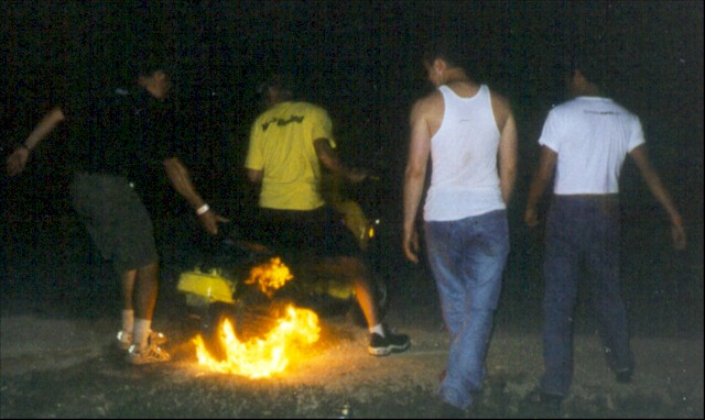 Motorcycle racers' pitbikes doing flaming burnouts. |